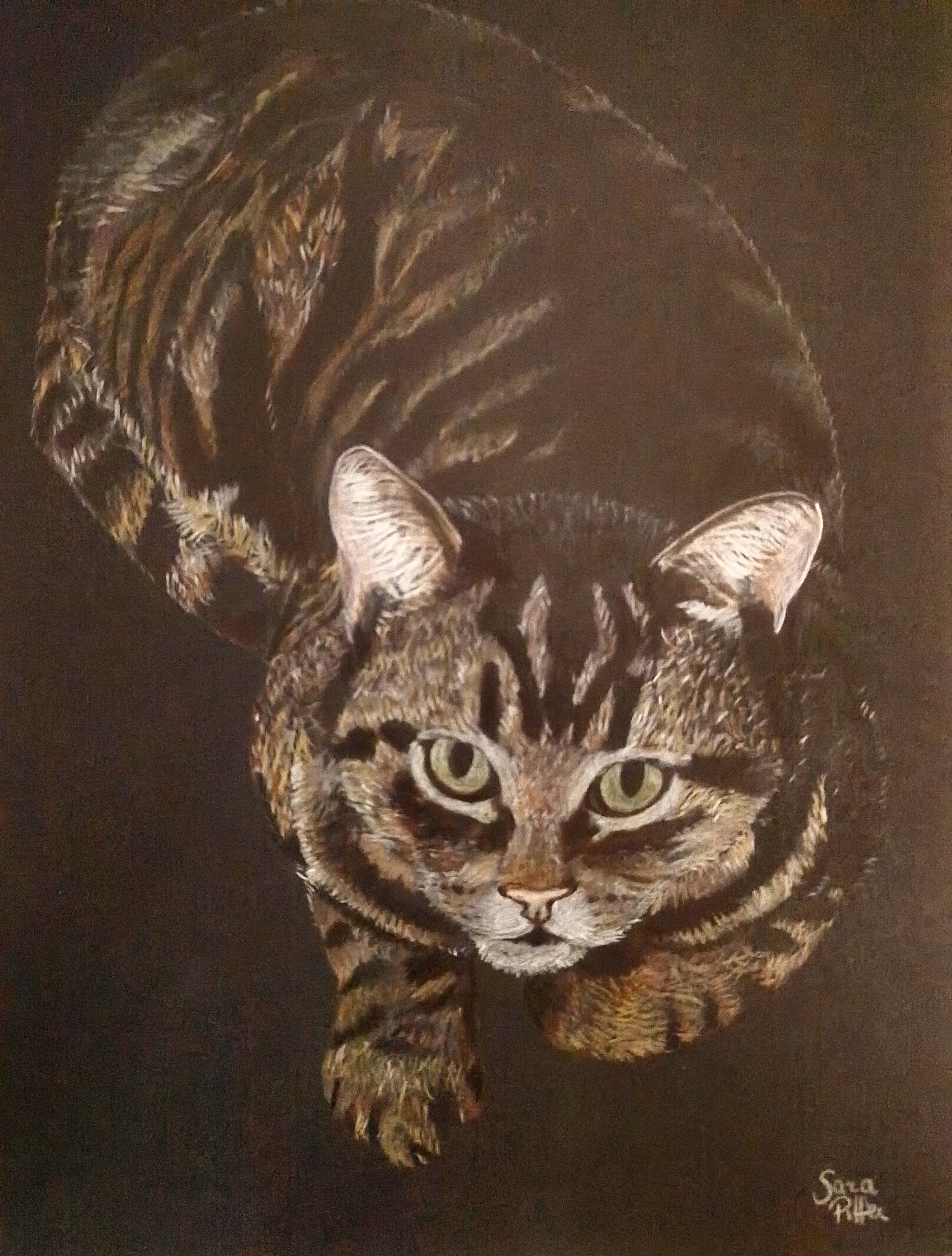 Questo dipinto ritrae il gatto di Sara, al quale era molto legata. Sara ha scelto di utilizzare il cartoncino nero per far risaltare al meglio i colori del pelo felino.