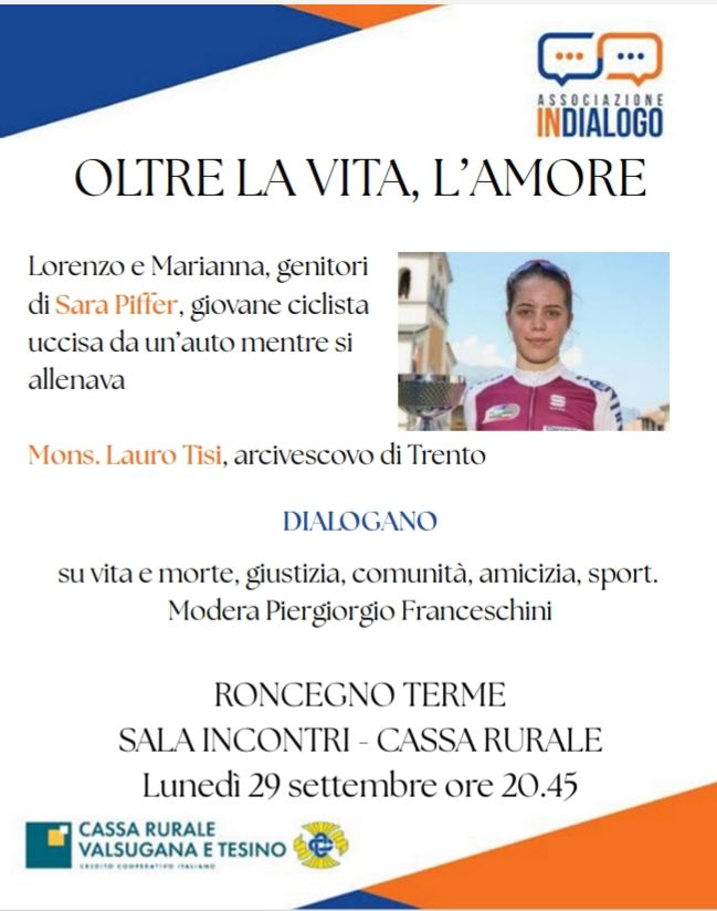 Serata ricca di emozioni anche nella sala dei vigili del fuoco di Roncegno Terme, con la partecipazione di un folto pubblico, venute ad ascoltare il vescovo don Lauro Tisi ed i genitori di Sara Piffer, che dialogavano, su argomenti come: vita e morte, fede e speranza, giustizia e perdono, sullo sfondo del commento alla lettera "Al di là", scritta dal vescovo alla comunità trentina in occasione della solennità di San Vigilio. L'incontro è stato moderato dal giornalista Piergiorgio Franceschini, il quale ha alternato gli interventi del vescovo e dei genitori di Sara. Alla fine dell'evento, come in ogni incontro fatto in precedenza, tante persone sono andate ad abbracciare e parlare con i coniugi Piffer, a prendere le immagini di Sara con le sue frasi.