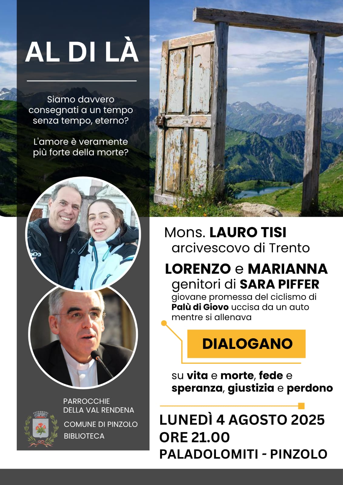 Serata densa di emozioni al Paladolomiti di Pinzolo, gremito di gente venuta ad ascoltare il vescovo don Lauro Tisi ed i genitori di Sara Piffer, che dialogavano, su argomenti come: vita e morte, fede e speranza, giustizia e perdono, sullo sfondo del commento alla lettera "Al di là", scritta dal vescovo alla comunità trentina in occasione della solennità di San Vigilio. L'incontro è stato moderato dal giornalista Piergiorgio Franceschini, il quale ha alternato gli interventi del vescovo e dei genitori di Sara. Alla fine del dialogo, è stata chiamata sul palco un amica di scuola di Sara, la quale dopo una breve presentazione, ha recitato una poesia scritta da lei per Sara. Una volta concluso l’evento tante persone sono andate ad abbracciare e parlare con i coniugi Piffer, tra le quali diversi genitori che come loro hanno perso dei figli.