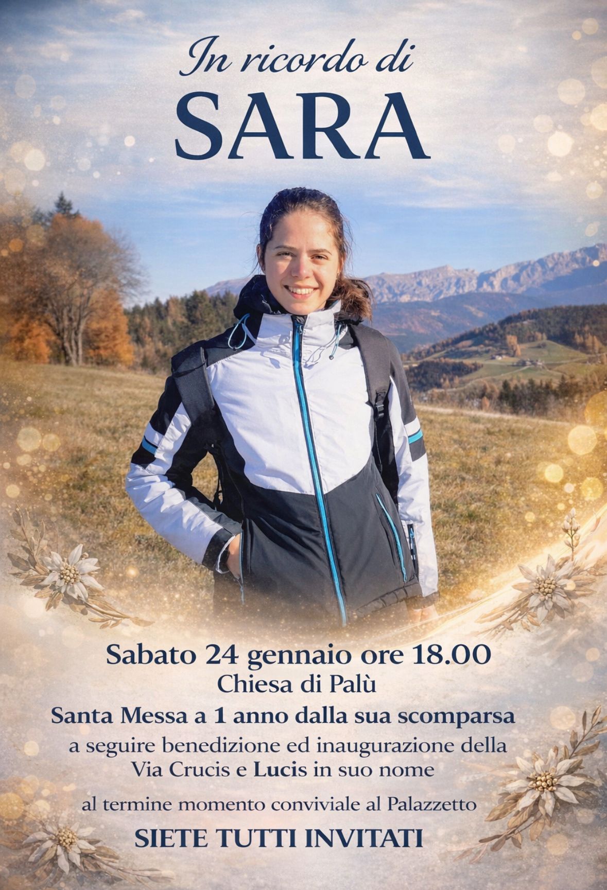 Ricorrenza speciale in ricordo di Sara nel giorno del suo primo anniversario, con una Santa Messa alla quale tutti sono invitati a partecipare, in particolare i giovani, la cui presenza – ne siamo certi – avrebbe reso felice anche lei. La celebrazione sarà animata sia dal coro parrocchiale che dal coro dei giovani, con anche una canzone suonata con il flauto di pan da un musicista speciale. Dopo la S. Messa ci si sposterà sulla strada che porta al capitello della madonna Ausiliatrice, per l'inaugurazione e benedizione della Via Crucis e Lucis realizzata in suo ricordo, in collaborazione con il Comune di Giovo, la parrocchia e la Cassa Rurale Val di Non, Rotaliana e Giovo. Seguirà un momento conviviale presso il palazzetto dello sport di Palù, una giornata quindi molto sentita sia dai famigliari, sia dalla comunità e dalle tante persone che in questo anno, sono venute a conoscenza di Sara.