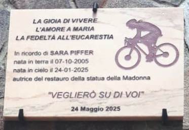 La S. Messa a 4 mesi dalla scomparsa di Sara, cade in una data significativa, infatti oltre a essere il quarto mese esatto dalla sua scomparsa, ricorre la festività della Madonna Ausiliatrice, quella della statua che Sara nel 2022 ha restaurato ed è sempre stata devota. La celebrazione è stata animata dal coro dei ragazzi e dai bambini della Prima Comunione, che in quell’occasione ringraziavano Gesù per il dono di averlo ricevuto. Alla fine della celebrazione, si è svolta una processione che partendo dalla chiesa è arrivata sino al capitello di Maria Ausiliatrice, durante il tragitto è stato recitato il rosario, con i bambini della Prima Comunione. Una volta conclusa la processione è stata scoperta una targa di ringraziamento a Sara per il restauro della statua, con le scritte “la gioia di vivere, l’amore a Maria, la fedeltà all’Eucarestia”, mentre il coro parrocchiale ha cantato la “Canzone per Sara” composta dalla capocoro prendendo spunto per il testo dal modo di vivere di Sara e le sue frasi.