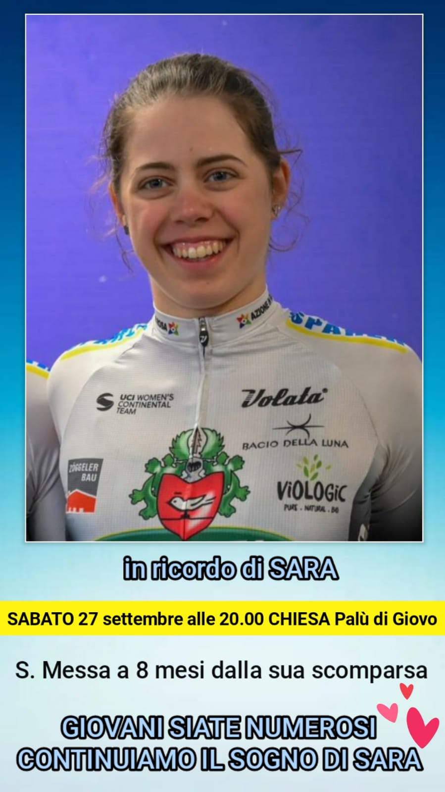 27 dicembre 2025: ore 19.30 Chiesa di Palù di Giovo Santa Messa in ricordo di Sara a undici mesi dalla sua scomparsa Come ogni mese, si rinnova il ricordo di Sara con una Santa Messa alla quale tutti sono invitati a partecipare, in particolare i giovani, la cui presenza – ne siamo certi – avrebbe reso felic...